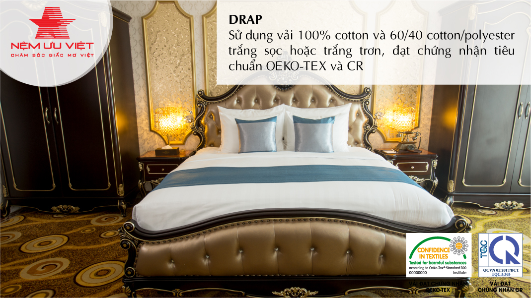 Drap bộ sản phẩm giường ngủ khách sạn Nệm Ưu Việt sử dụng vải 100% cotton và 60/40 cotton/polyester trắng sọc hoặc trắng trơn, đạt chứng nhận tiêu chuẩn OEKO-TEX và CR, hoàn toàn an tâm về mức độ an toàn, đặc biệt phù hợp với người hay mẫn cảm da và trẻ em nhỏ.